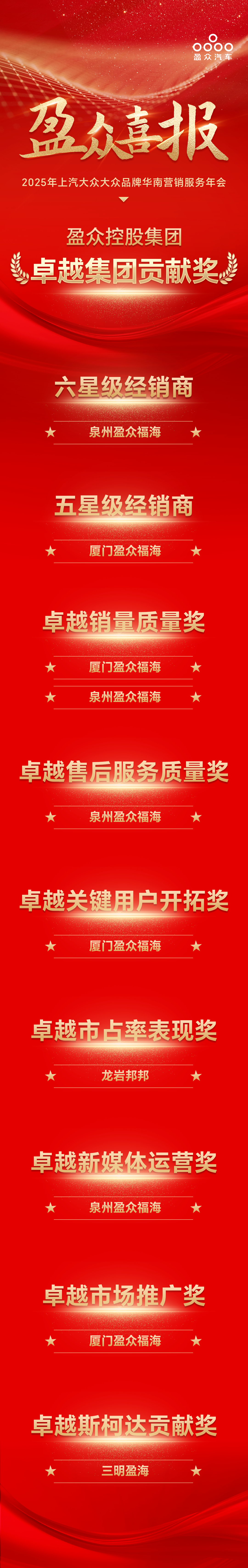 載譽而歸,碩果累累。每一份榮譽都凝聚著廣大客戶、合作伙伴的信任與支持,也見證了盈眾多年來深耕上汽大眾品牌的決心與積淀。在 2025 年新的征程中,盈眾將以此為新的起點,把榮譽轉化為前進的動力。秉持“用科技和文化,讓人們的汽車生活更美好” 的使命,不斷創新服務模式,提升服務品質,為客戶打造更加便捷、舒適、智能的汽車生活體驗,持續為上汽大眾品牌的發展貢獻力量,攜手共創更加輝煌的未來。